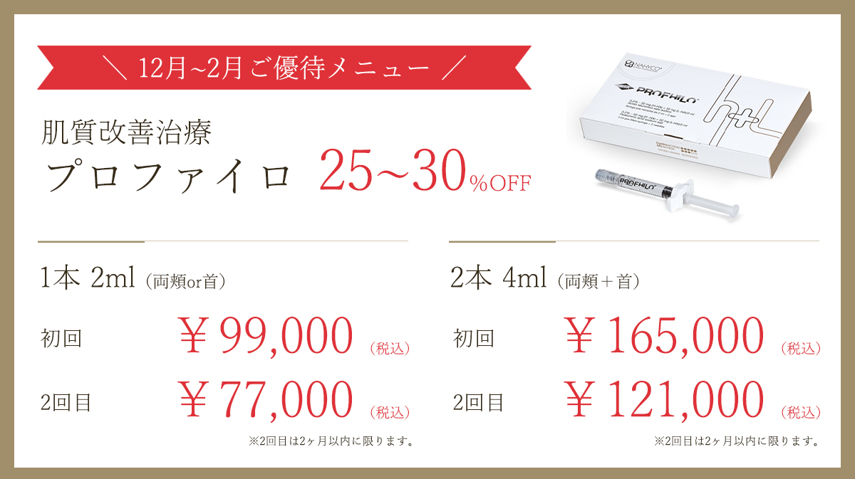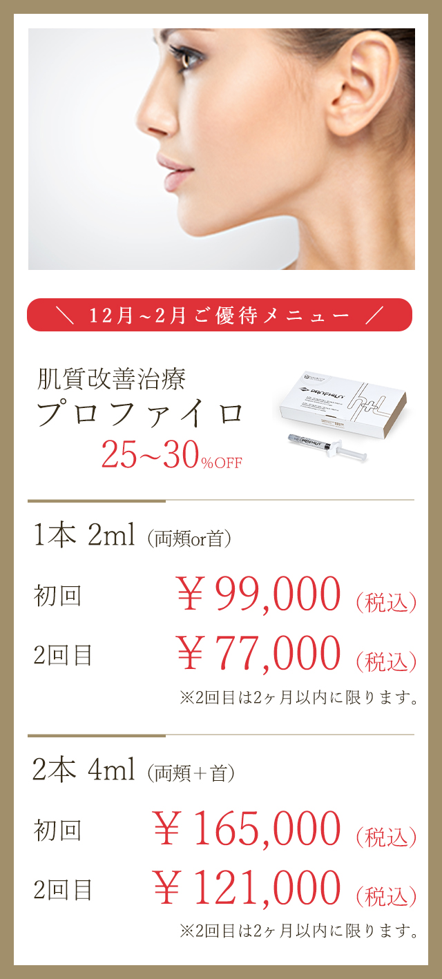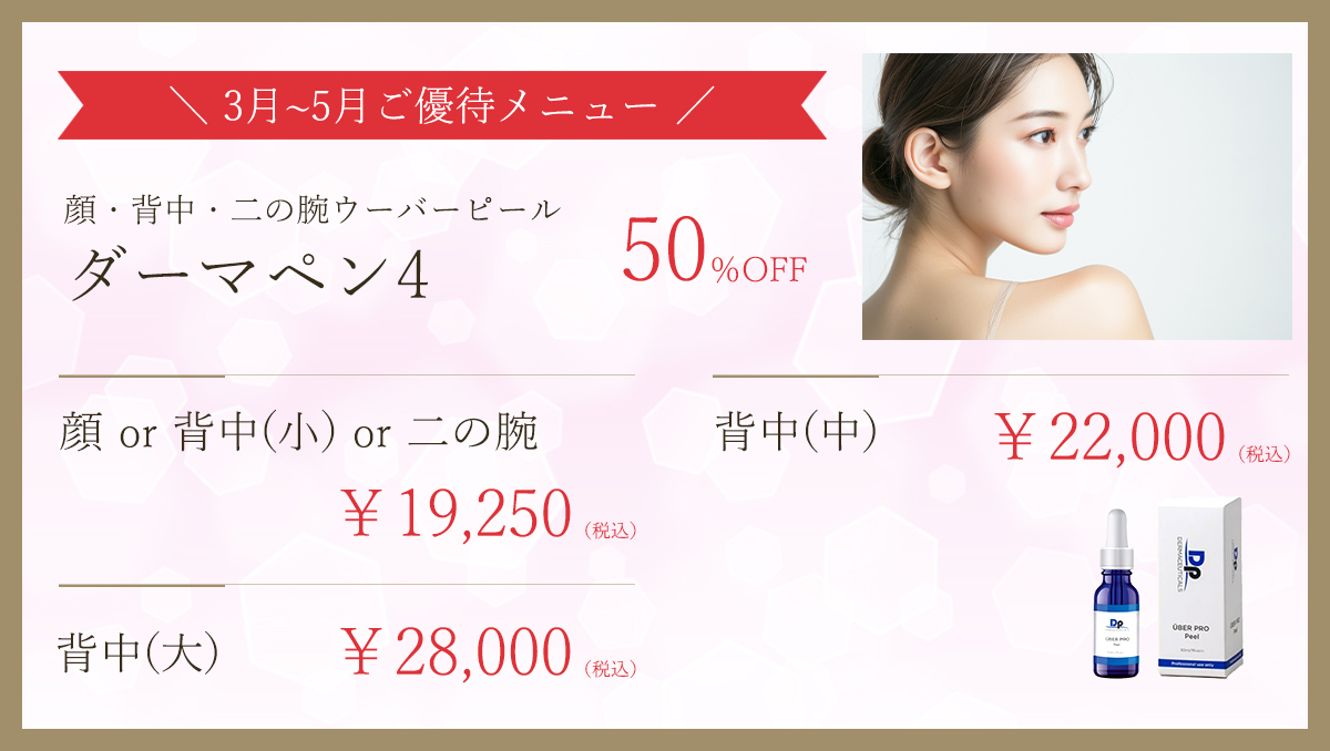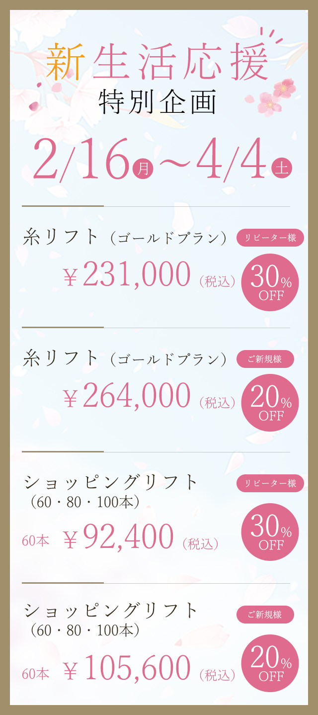 当院で美容外科手術をお受けになった方は、下記施術の中から1つ、半額でお受けいただけます。この機会にぜひお試しください。