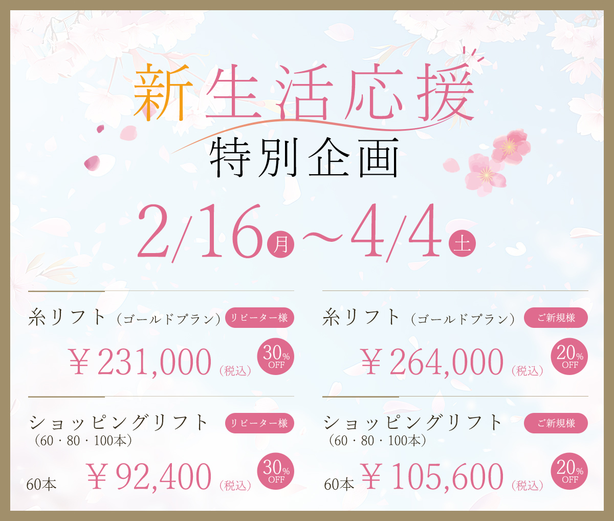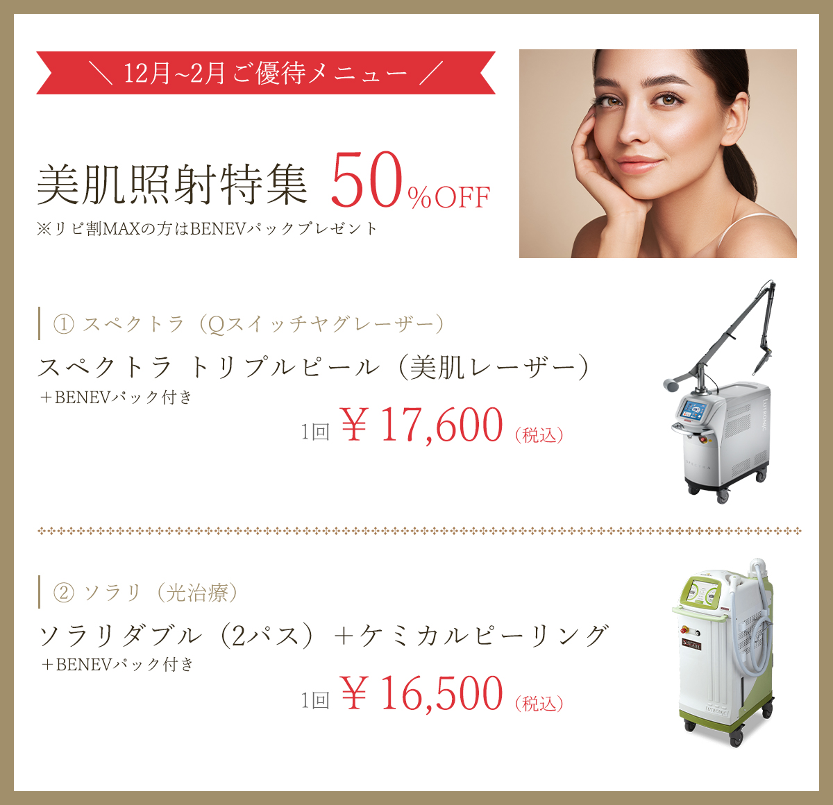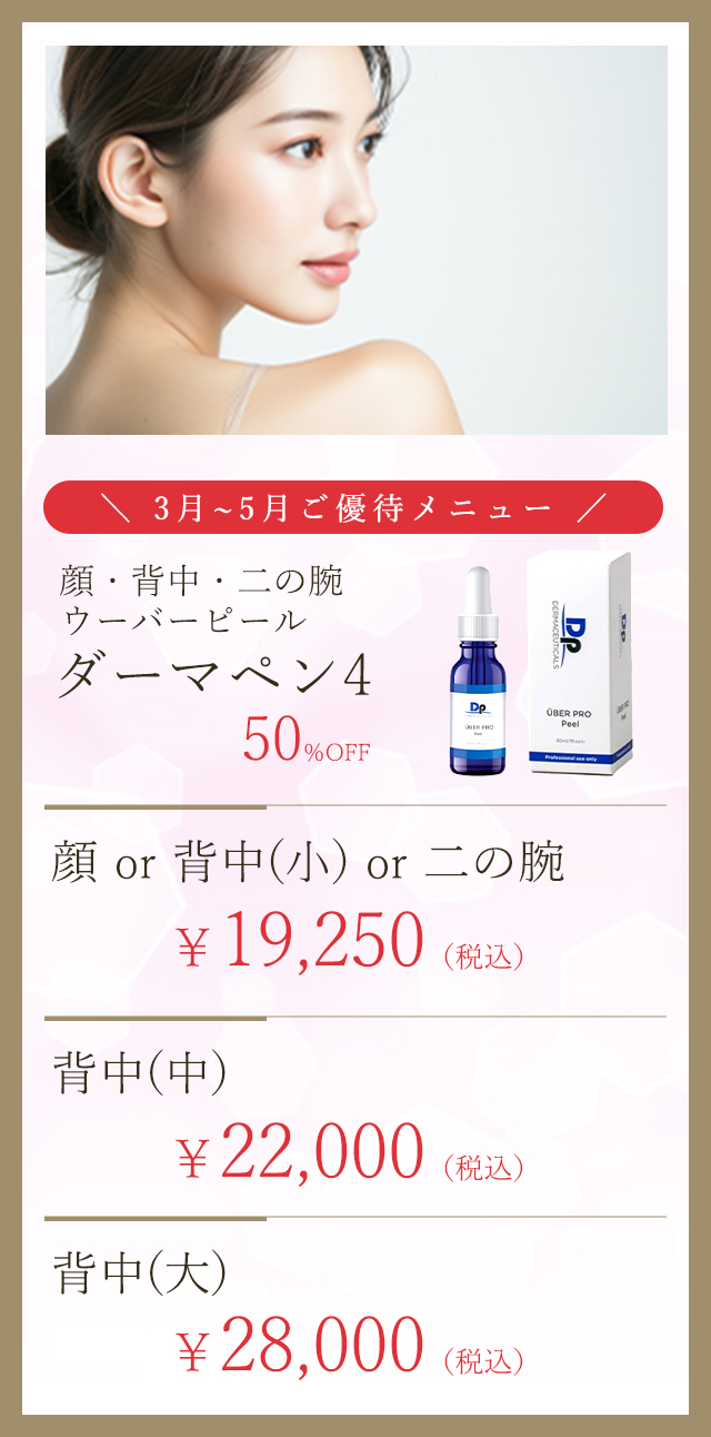 当院で美容外科手術をお受けになった方は、下記施術の中から1つ、半額でお受けいただけます。この機会にぜひお試しください。